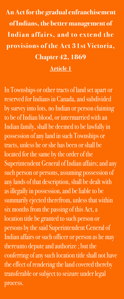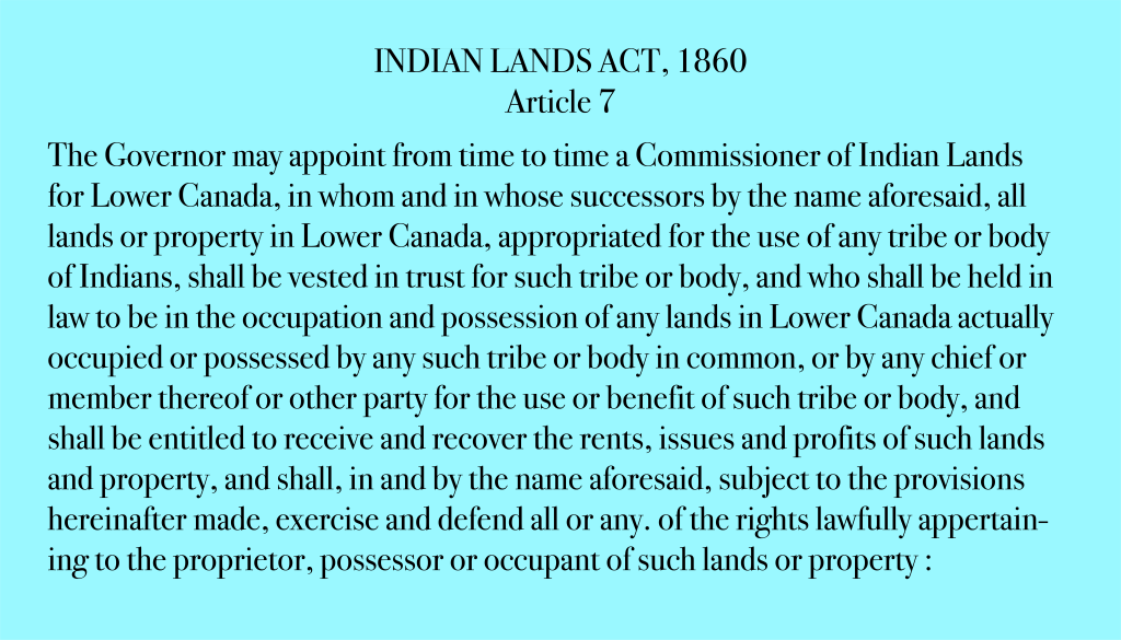 “No person shall sell, distribute, or otherwise dispose of, to any Indian within Lower Canada, or to any other person for their use, any rum or other strong liquors, of what kind or quality soever, or shall knowingly or willingly suffer the same, in any manner, to come to the hands of any Indian:” Article 1 of the Indian Lands Act (An Act respecting Indians and Indian Lands).